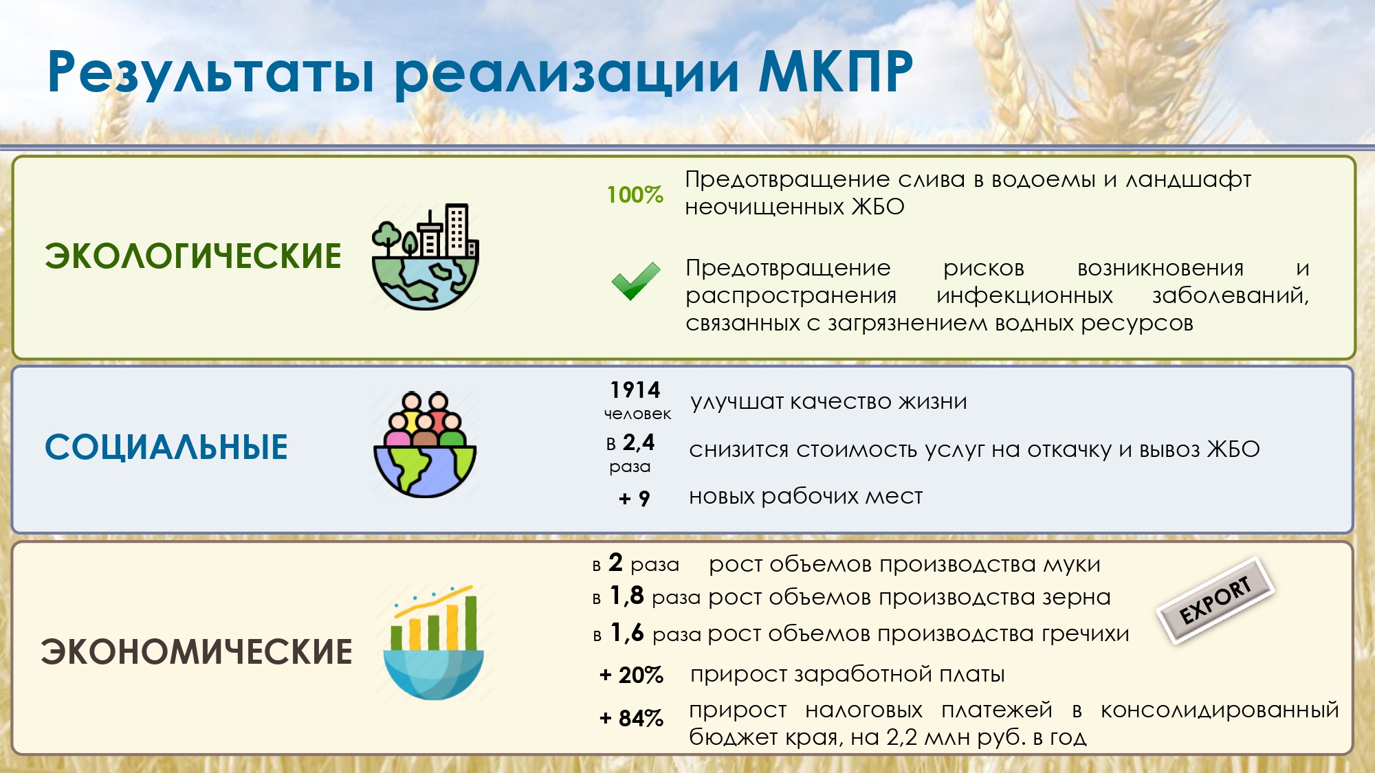 Увеличение объемов производства гречихи, зерна, муки, обеспечение занятости местного населения, ремонт автомобильных дорог, обеспечение условий для санкционированного вывоза и утилизации ЖБО.