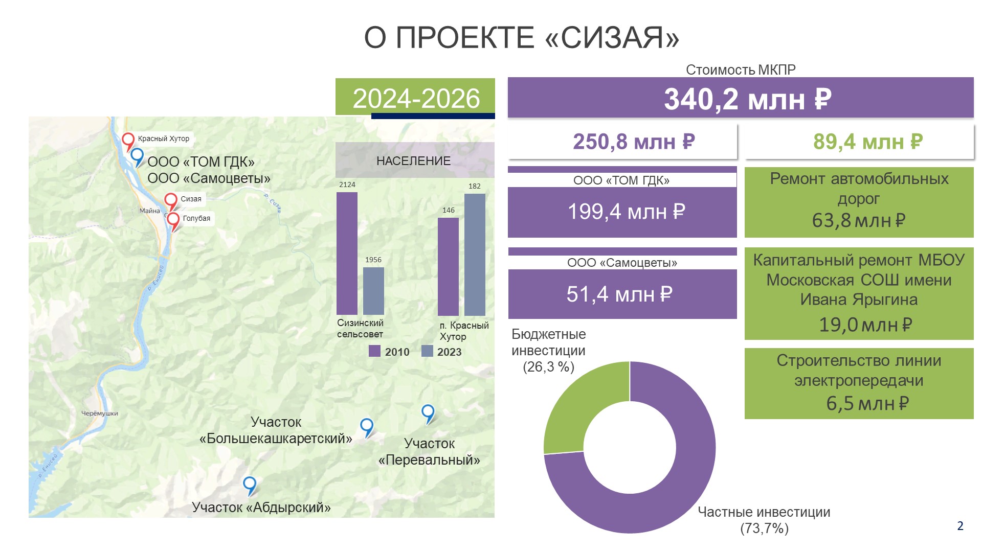- создание комфортных условий для жителей, в том числе специалистов предприятий ООО «ТОМ ГДК» и ООО «Самоцветы»;- обеспечение безопасного движения жителей Сизинского сельсовета, школьных и рейсовых автобусов, туристических групп по автомобильным дорогам местного значения;
