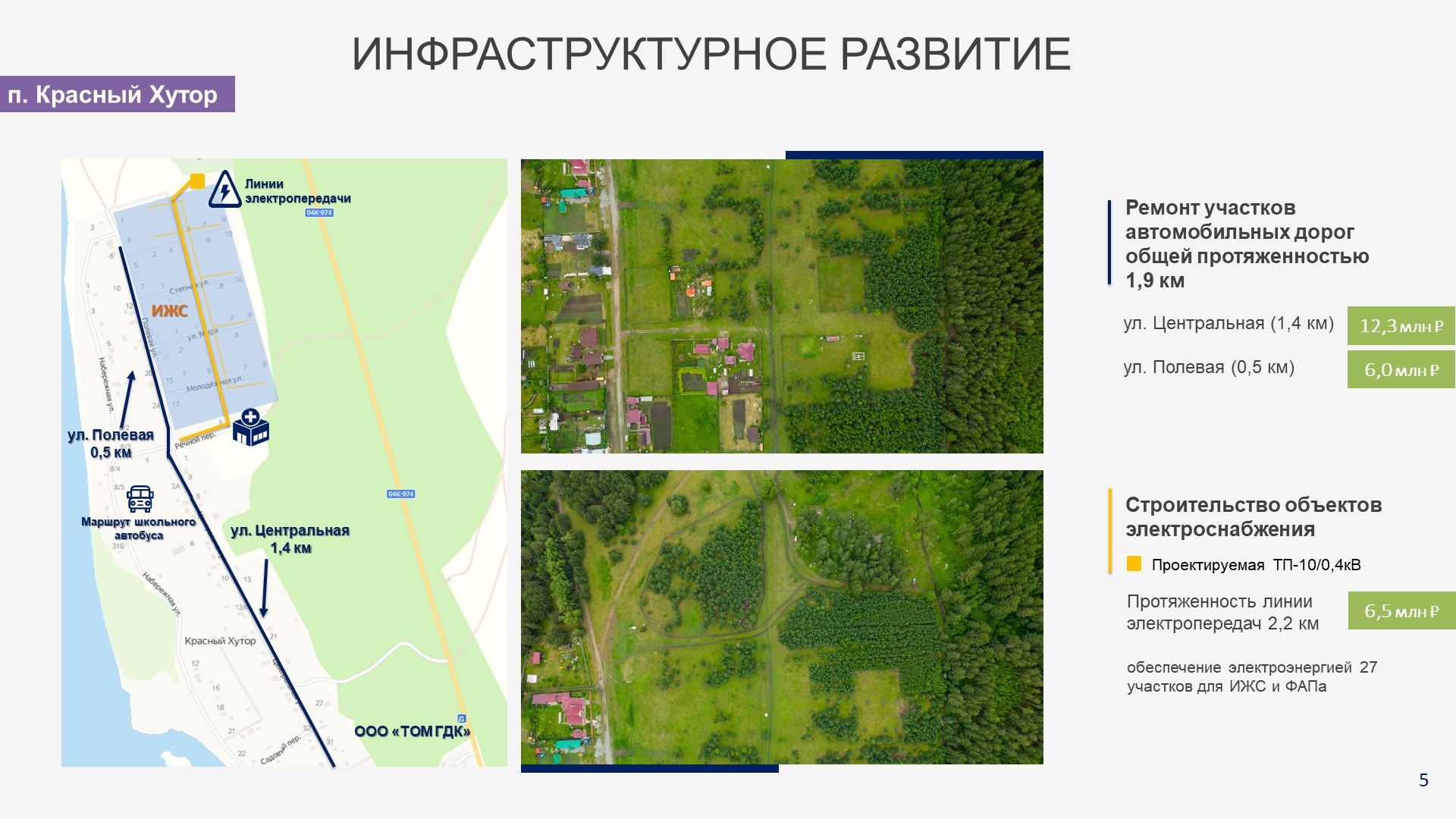 - создание условий для начала жилищного строительства на 27 земельных участках и обеспечения электроэнергией модульного ФАПа в п. Красный Хутор