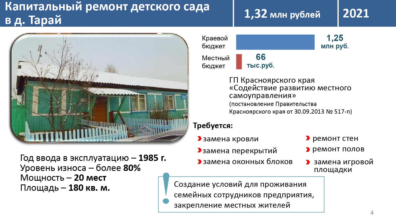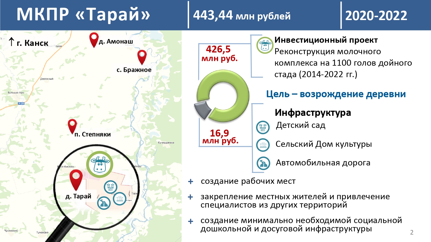 МКПР-обеспечение населения деревни Тарай Канского района качественными и безопасными услугами дошкольного образования и культуры, а также содействие в привлечении кадров на село.