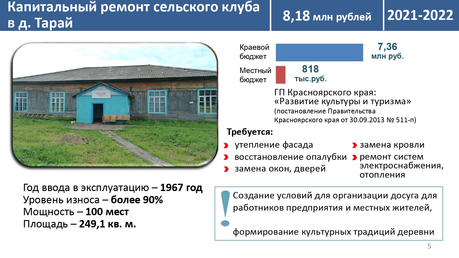 - Капитальный ремонт сельского клуба;