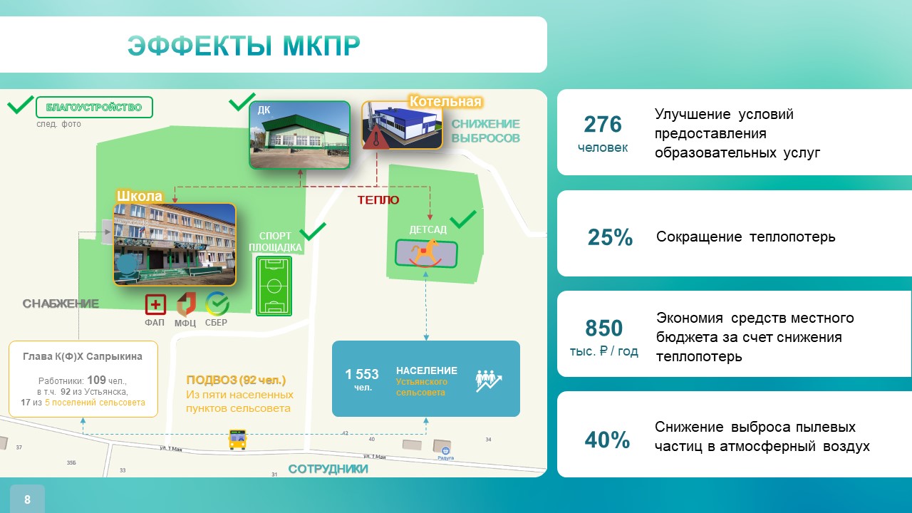 Сохранение численности населения, создание комфортных условий проживания, улучшение качества образовательных услуг и услуг жилищно-коммунального хозяйства, в том числе путем обновления материально-технического состояния образовательного учреждения сельской местности. Создание современных условий для проживания на территории работников инвестора, с целью закрепления кадров и повышения уровня занятости населения.